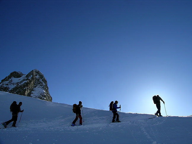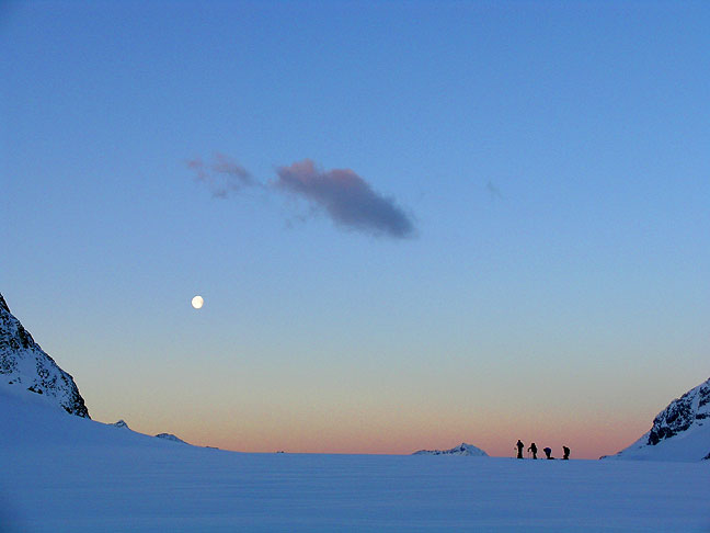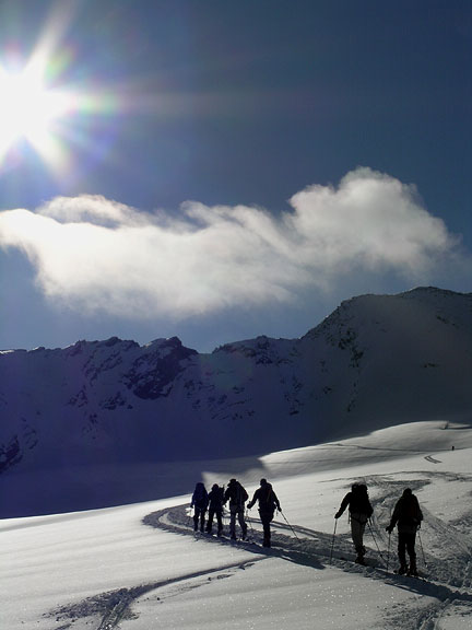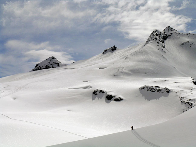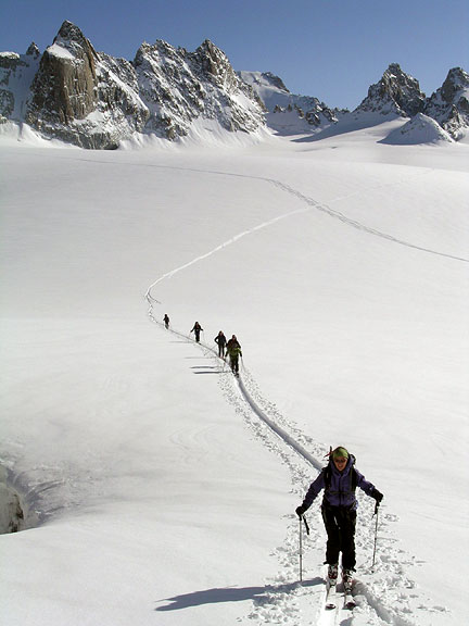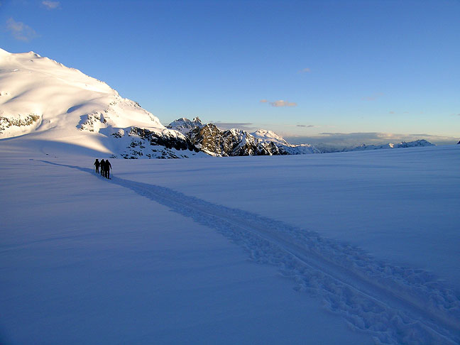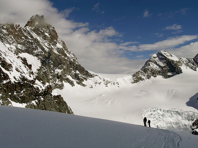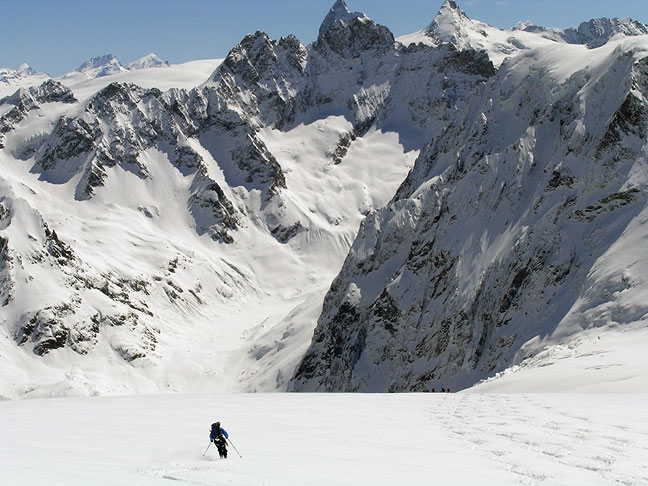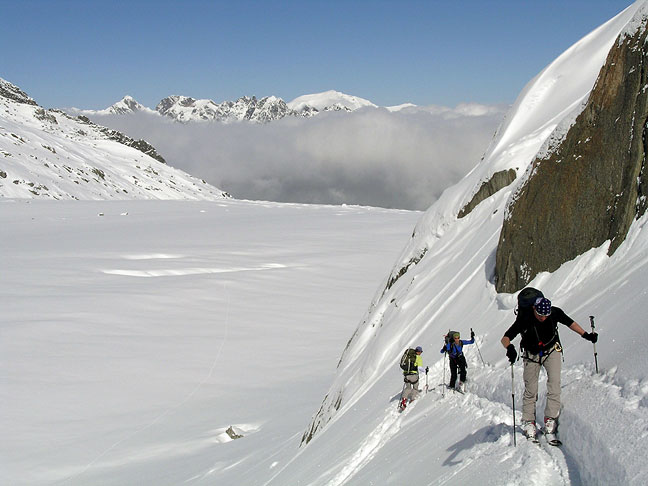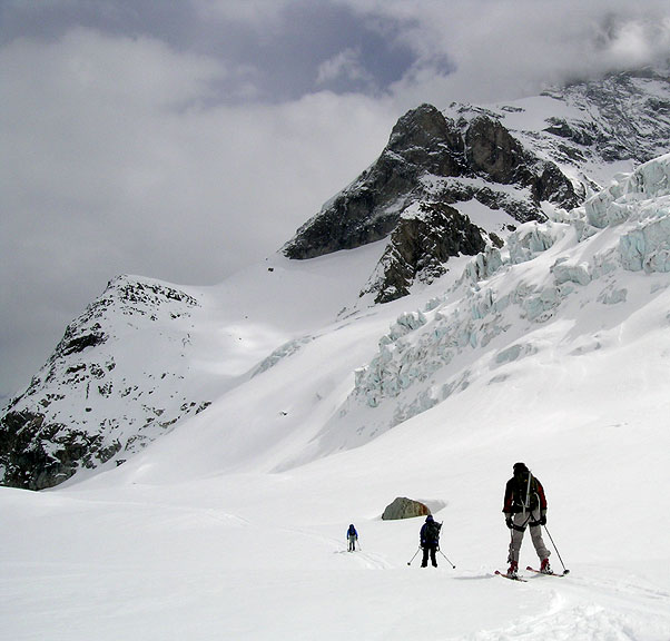 | Skinning up the wide open glaciers of the Rosa Blanche. |
