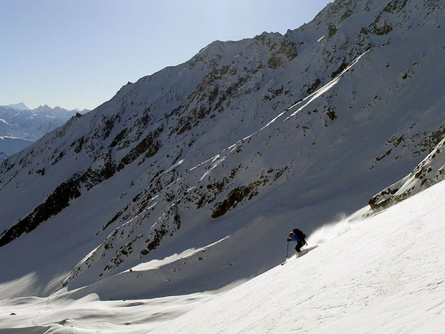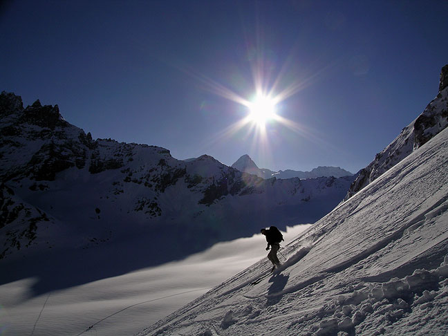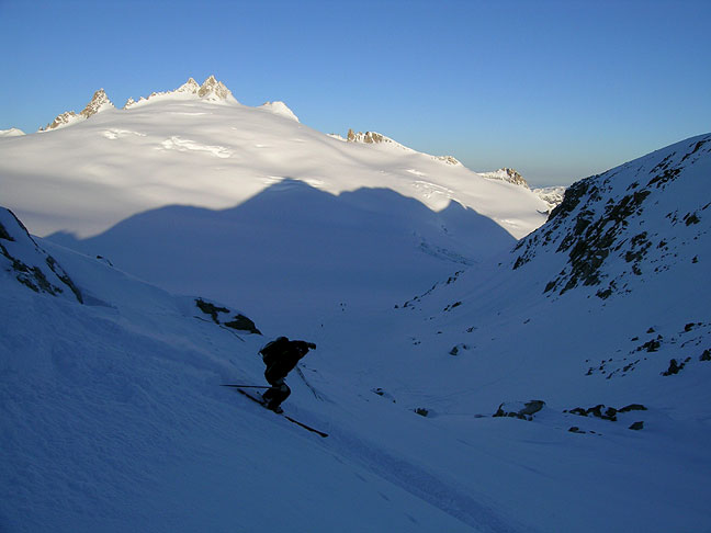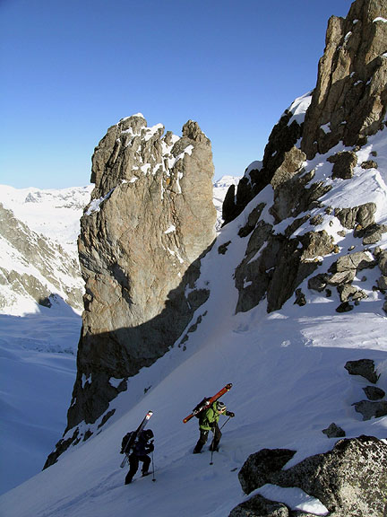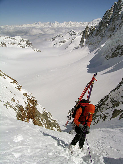 | Descending the steep couloir on the east side of the Col du Chardonnet. |