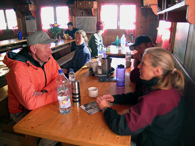 | Chris, stacey, Patrick, Grant and Kathy enjoy tea in the Trient hut. |