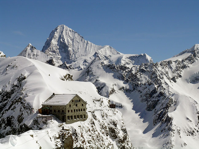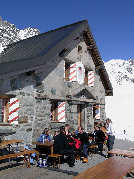 | Despite the blue skies here, the forecast was not good. fearing we would get stuck in the Valsorey hut if we continued on our original plan to traverse the Plateau du Couloir, we elected to alter our route and go via Verbier. So our goal for the day was the Cabane du Mont Fort, seen here. The Mont Fort hut has recently been remodeled and now includes that wonderful luxury of hot showers! |