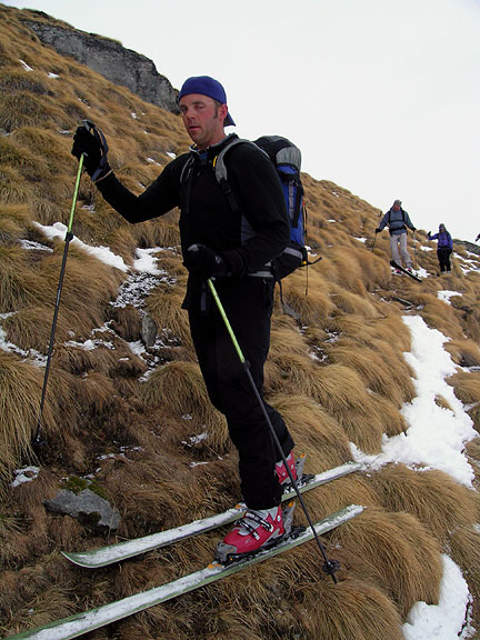| Grant look skeptical as he crosses a short section of variable skiing. |