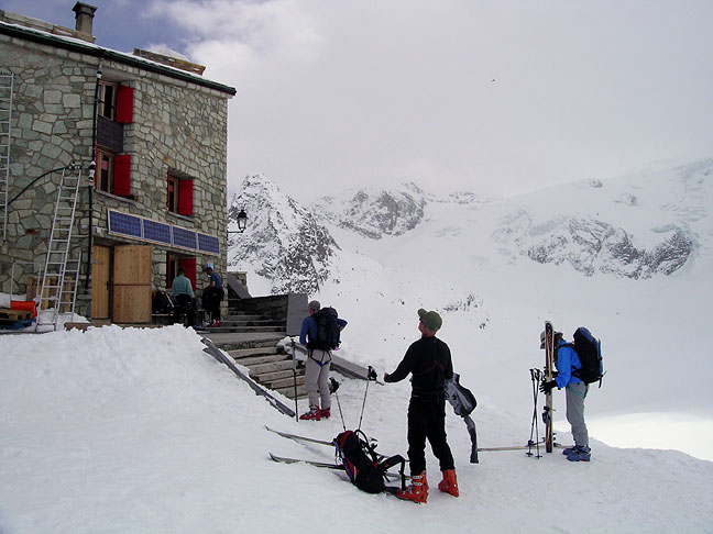 | The Mont Fort hut on the following morning. You can see the poor weather engulfing the Mont Blanc massif in the background. Unfortunately, Bob decided to tackle a trail-side blob of frozen snow on the descent into Champex, taking the brunt of force on the his shoulder. With it still hurting after a night of "rest" at the hut, he thought it best to ski out while this was still easy to do. So we bid him farewell, as he descended to Verbier and we continued upward in the near-whiteout. Bob caught a flight home early and managed to catch up with his wife in the Bahamas! |