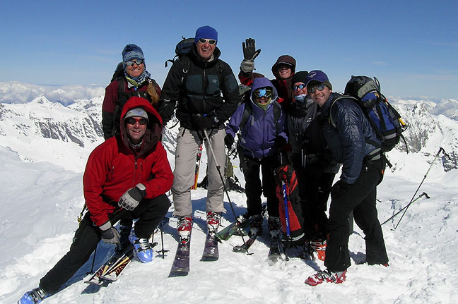 | And a couple hours later, we reach the summit of the Pigne d'Arolla. Left to right are Mark (in front) Kathy, Chris W., Stacey, Patrick, Chris L., and Grant. |