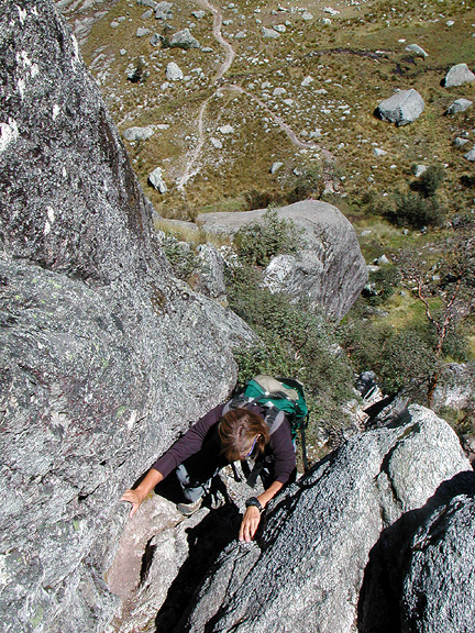 | We again began with a day "hike" to Laguna Churup at 4485 meters above sea level (14,870 feet). Laurel is a keen rock climber, so we went a bit out of our way to find some appropriate recreation along the way. |