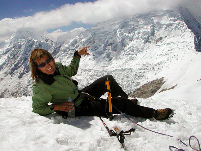 | After the lung-busting start, the climb was straightforward, if hot. Laurel here takes a break before the final steep summit slope. The busted-up face of Palcaraju is in the background. |