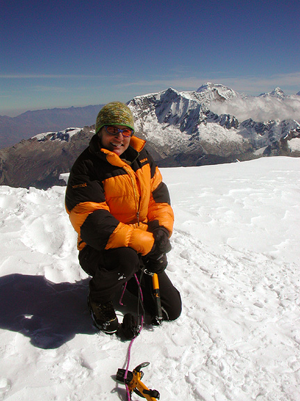 | Laurel enjoying beautiful weather on the summit of "Toclla". The impressive South Face of Cop-a in the background here. |