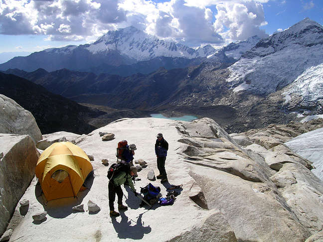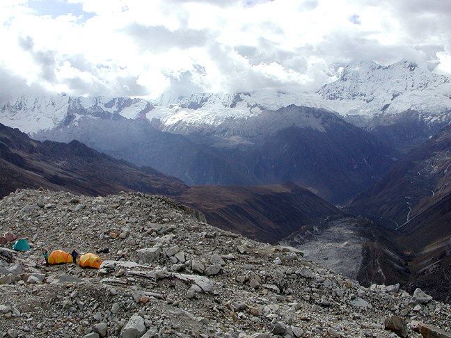 | Many climbing groups appear to have determined that Alpamayo and Huascarán are both out of condition, or too risky, this year. This, plus political unrest temporarily closing the border with Bolivia, resulted in much traffic being diverted to the Ishinca Valley and Chopicalqui. Our arrival at Moraine Camp coincided with that of a very large asian expedition, plus a half-dozen other smaller parties. The usual camp being "chocker" as our Kiwi friends would call it, we found a gorgeous camp with expansive views (and better water gathering), just above. |