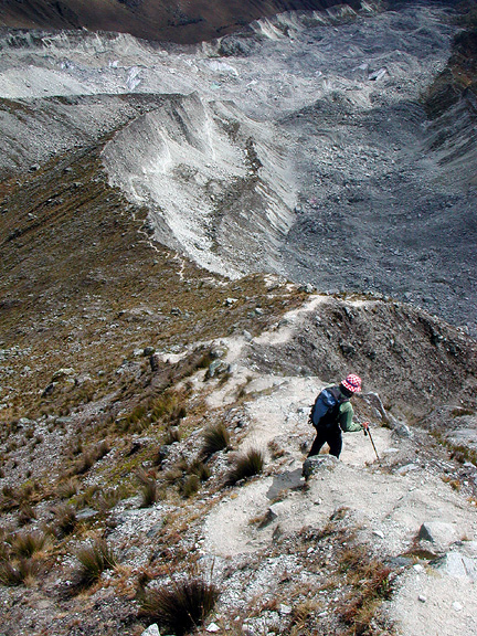 | Our next and final project was 20,817 foot Chopicalqui. Acclimatized and (we hoped) rested, Laurel, Kathy, Peter and his cousin Miguel headed straight to moraine camp, at above 16,000. Although Laurel is seen here on descent, the approach to camp follows this dramatic moraine, where the traces of glacial flow and retreat can be easily seen. |