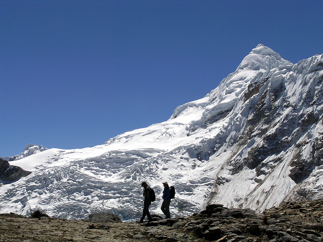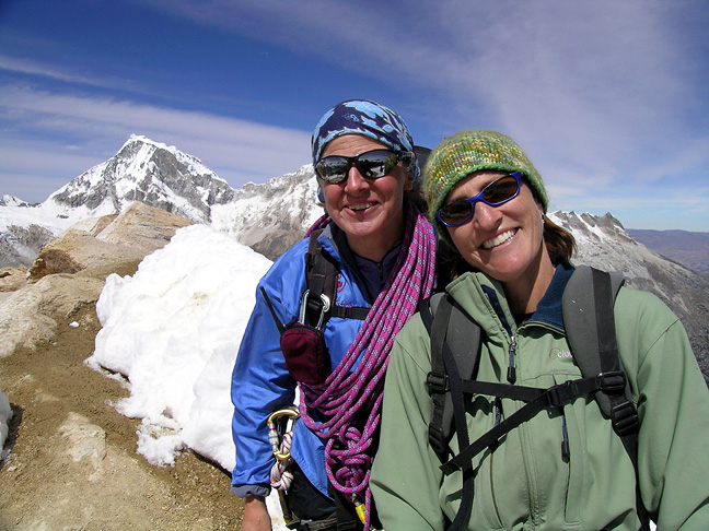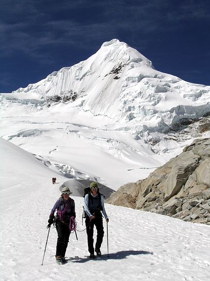 | Descending from Tocllaraju, Kathy and Laurel were met by Mark and Peter, to help them carry their high camp down to base camp. We couldn't have asked for a better day! |