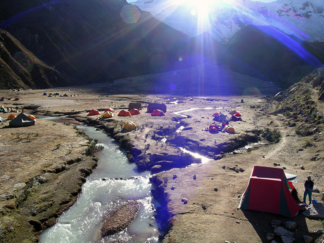 | For our camp in the Ishinca Valley, we have become attached to a site in a relatively "upstream" location, with morning sunlight starting from about 8am. |