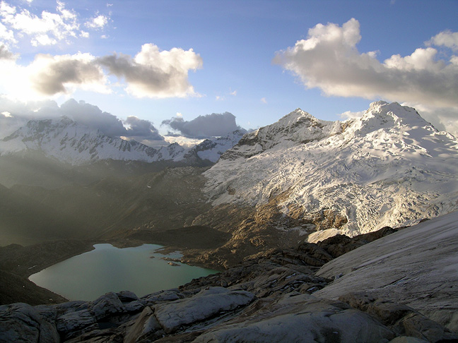 | Another rest day, and it was off to Tocllaraju. The top part of its West Face is seen here in the background. |