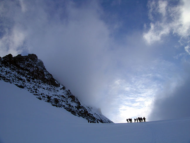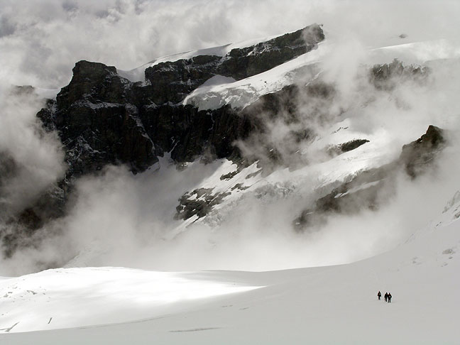 | Our original plan had us climbing over Castor the second day. However, much recent snow and winds from the NE loaded the slopes of Castor and gave concerns about avalanches. So instead, we climbed Pollux, on the left in this photo, then descended into the valley, reaching our next hut, the Sella, by climbing up to it. These climbers in this photo are trying to decide if they will go up Castor. In the end, none did. |