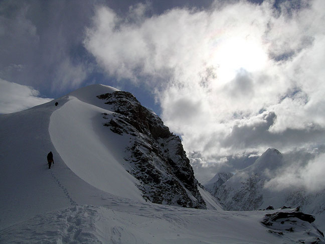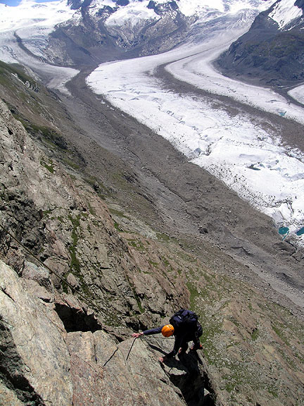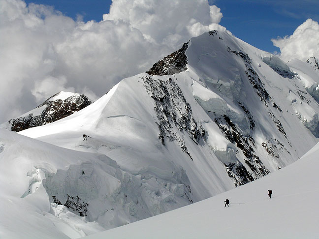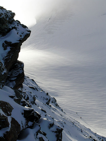 | The following day we traversed the Liskamm Nose, en route to the Margherita hut. Here, we are descending off the east, less steep, side of the Nose. |