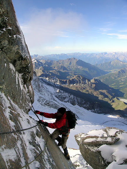 | Dave climbing on the Eck route on the Riffelhorn. This is very good training for climbing in big mountain boots. |