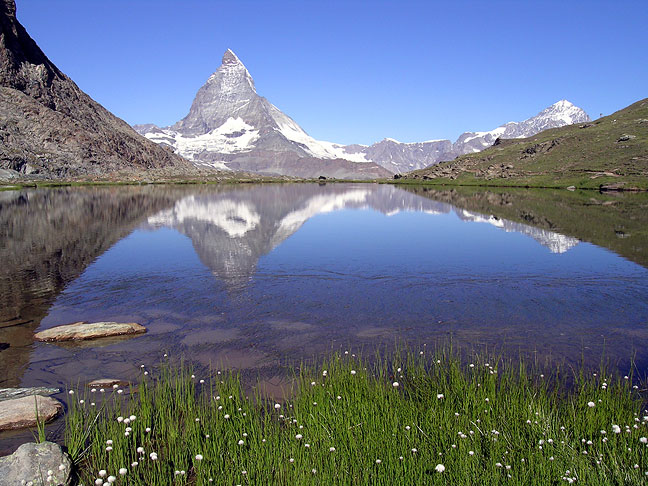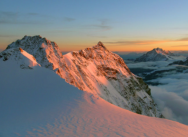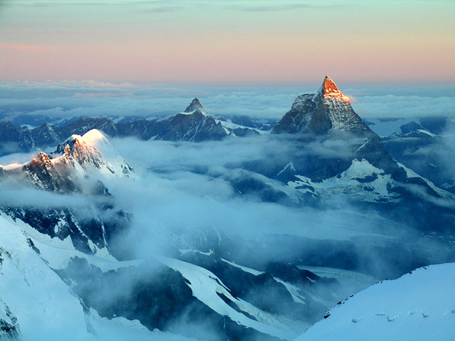 | The following morning we climbed the Zumsteinspitze, the 5th highest peak in the Alps, before descending to Zermatt. Here, the morning sun just catches the summits of the Breithorn and the Matterhorn. |