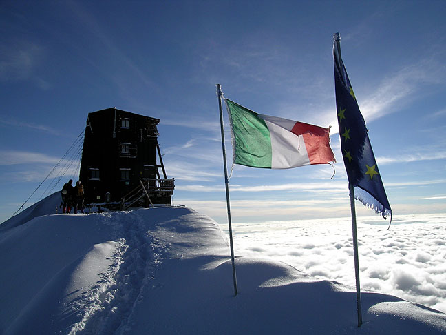| The Margherita hut on the Swiss-Italian border. This hut is the highest in the Alps, sitting on the summit of the Signalkuppe at 4559 meters (14,954 feet). |
