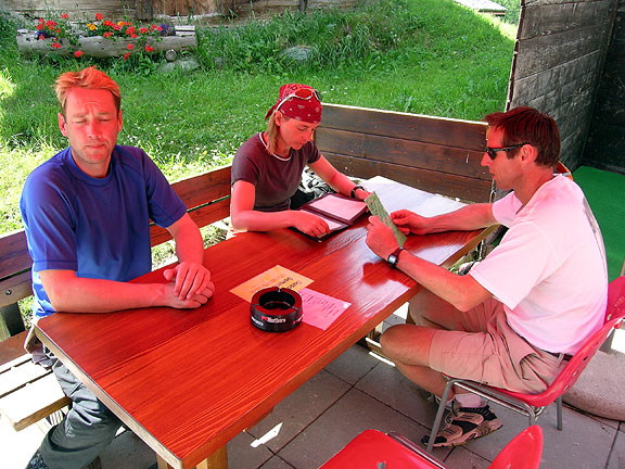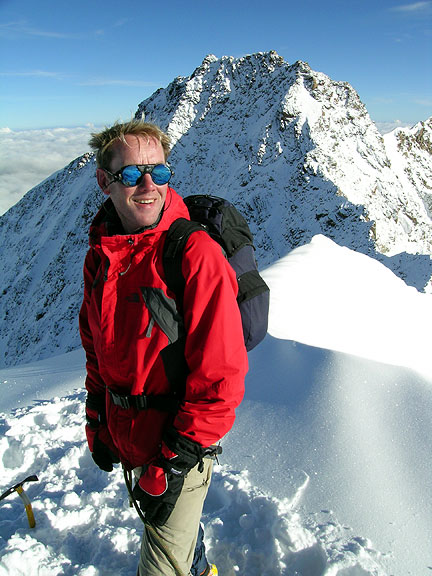 | David Dougherty hails from North Wales. He came to the Zermatt area for a week of climbing with Mark, and designs on the Matterhorn. we started with the "Spaghetti Tour" so named for the Italian huts it visits, did a bit of rock on the Riffelhorn, and made an attempt on the Matterhorn. Unfortunately, the weather on our summit morning was poor and we were forced to turn around only about 30 minutes into the climb. David plans to try again next year. |