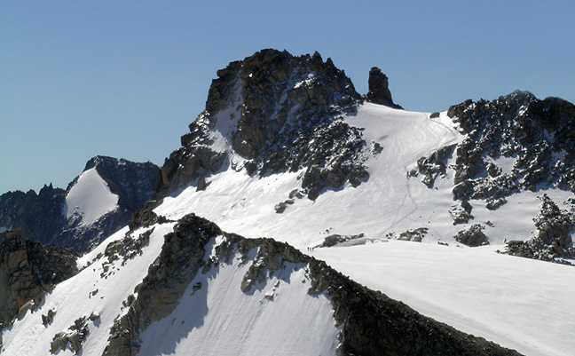 The Petite Fourche as seen from near the Aiguille du Tour. You can make out the track leading to the snowy col. Then the route follows the rocks to the highest summit, the left-hand peak. |