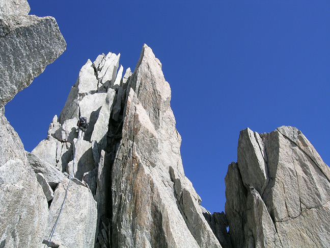 | With the Forbes Arête out of condition, we opted for a rock route on the Aiguille Purtscheller, seen here. The classic route, and the one we did, is the South Ridge with climbs the left skyline from the deep notch. The first pitch was pretty chilly, in the shade, but after that we were in the sun almost the entire way. |