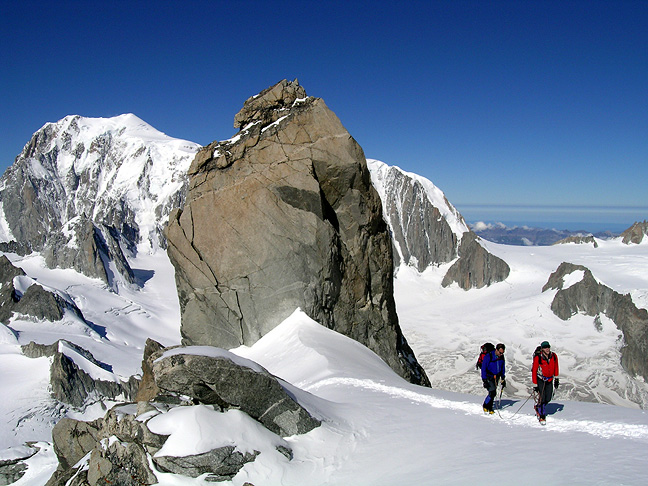 | For our last climb, we chose the absurdly scenic Rochefort Arête, a famous snow ridge that runs along the Franco-Italian border. In this photo another party arrives at the Salle à Manger (the "Dining Room") and the start of the Arête proper. Behind is Mont Blanc. |