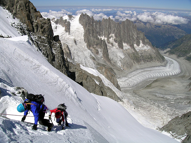 | Another party negotiates a steeper pitch on the Arête. Behind are the Chamonix Aiguilles and the Mer de Glace. |