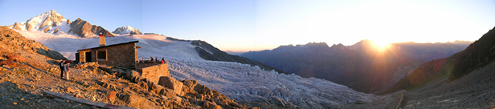 This is a "stitched" together photo taken at sunset from the Albert Premier hut. The Chardonnet is the peak behind the hut. |