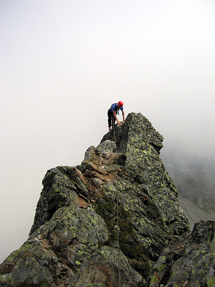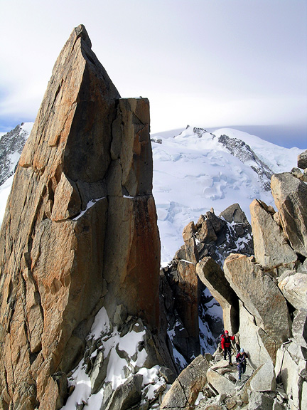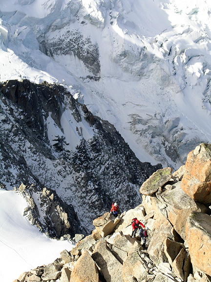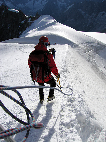 | We started with the old classic the Arête des Cosmiques. The weather was a tad funky this day, and the forecast was not very encouraging. But a bit of cloud is just right for the Cosmiques. Here, Mark makes his way down the arête off the top of the Aiguille du Midi. Kathy apparently took this photo while she was walking! |