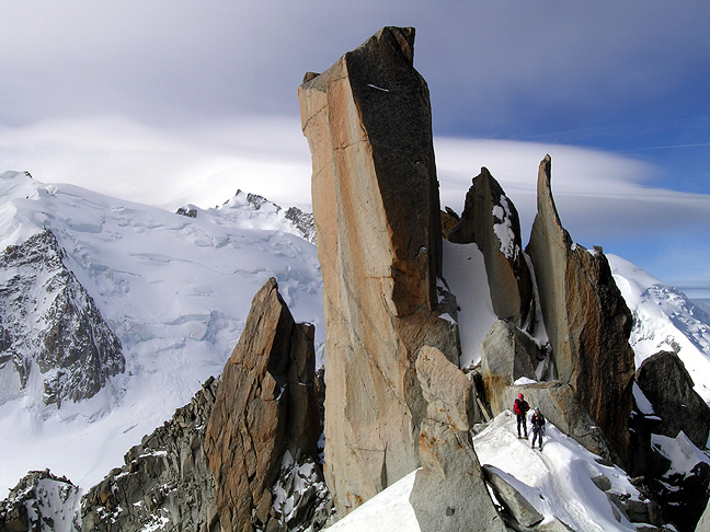 | Mark and Kathy among the towers on the Cosmiques. You can see the large lenticular clouds over Mont Blanc. |