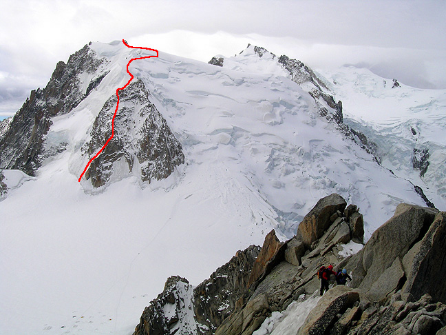 | For our last route we chose the Contamine-Grisolle on the North Face Triangle of Mont Blanc du Tacul. This is a fun mixed route and one of our favorites in the area. This photo, showing the route, was take from our ascent of the Cosmiques Arête a few days earlier. |