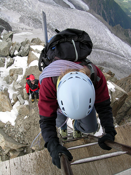 | The final moves of the Arête des Cosmiques, Kathy ascends the ladder. |