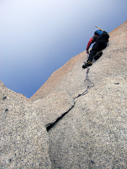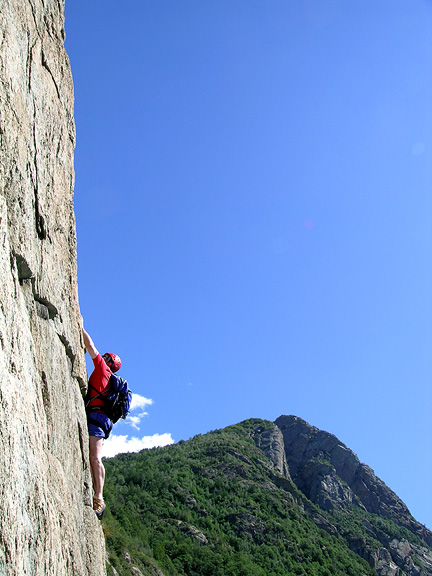 | Mark moves up the clean rock of Machaby. I'll have to admit to tilting this photo slightly. I couldn't resist. |