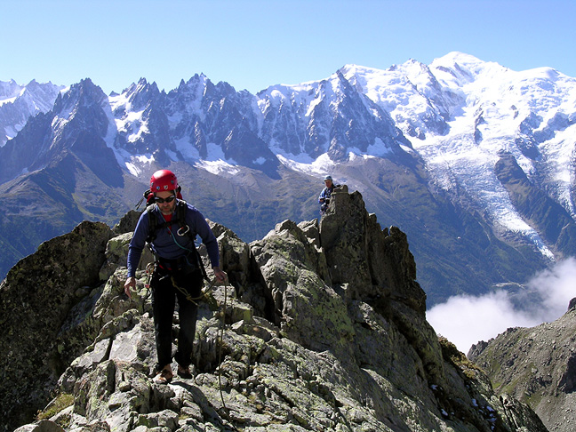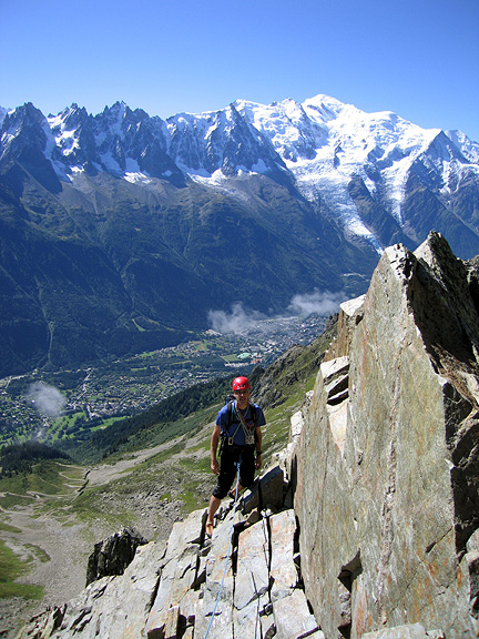 | The fantastic backdrop of the Mont Blanc Massif is only one of the many benefits of climbing in the Rouges. In this photo Jay and Kathy are climbing on the SE Ridge of the Index. |