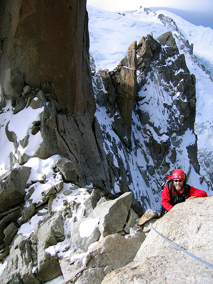 | Our next outing was into the Aiguilles Rouges, where we climbed the Aiguille de l'Index as well as nearby Mani Puliti. Here, Mark moves up the Index. |
