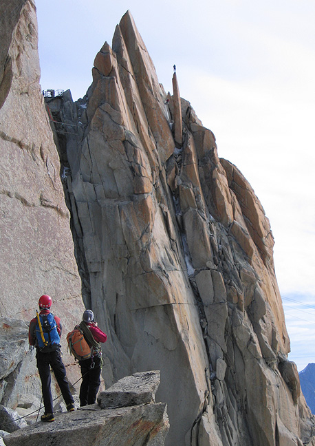 | While we were enjoying our climb, a braver soul was scaling the rather pointed spire known as the "Obésisque", across the way. Jay and Mark look on. |