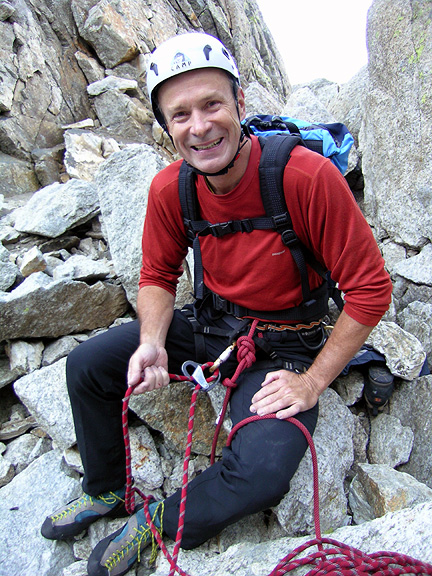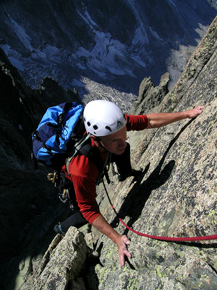 | Emery moves easily up the one of the crux pitches of the route, where steep face climbing leads to a very airy crest. |