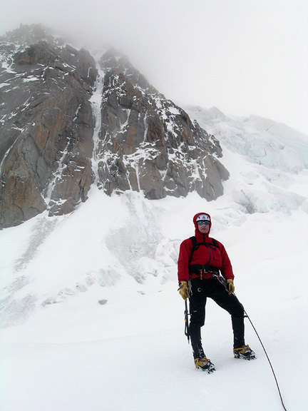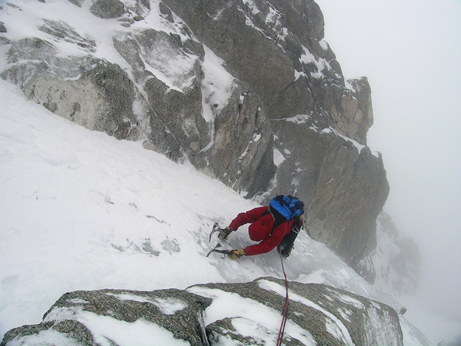| But the fine weather was short-lived and the following days found us wandering around in the mists. On this particular day we climbed the Chèré Couloir, in this image above and left of Emery. This is a fun ice route with about 4 pitches of steep ice to perhaps 80° degrees. Though the weather and views were not ideal, it proved to be a great day for this route, as there were few other climbers about and the cold wind and cloud kept everything well frozen in place. |