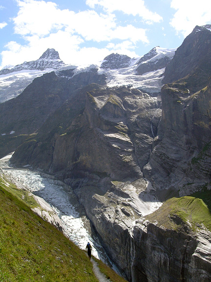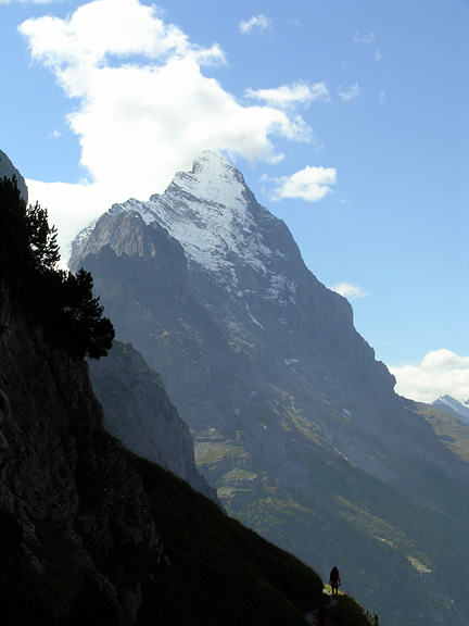 | With poor weather in Italy, and precipitation up and down the Franco-Italian border, we decided that the only place we were to find clear skies was as far north as possible. We chose the Wetterhorn, just above Grindelwald, as our next objective. In this photo we are hiking into the Gleckstein hut, the normal starting point for this climb. The Mittellegi Ridge on the Eiger behind looks pretty snowy. |