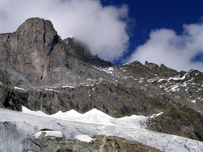 | Looking up at the Wetterhorn from a point about an hour's walk above the hut. the route crosses the small glacier in the foreground, gains a faint rock spur on the right and climbs up to the saddle on the skyline, just to the right of the photo center. From there it crosses on the other side of the ridge (barely) and climbs up to the summit on the left. |