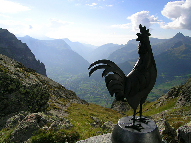 | Looking down towards Grindelwald from the Gleckstein hut. A bronze rooster stands guard. |