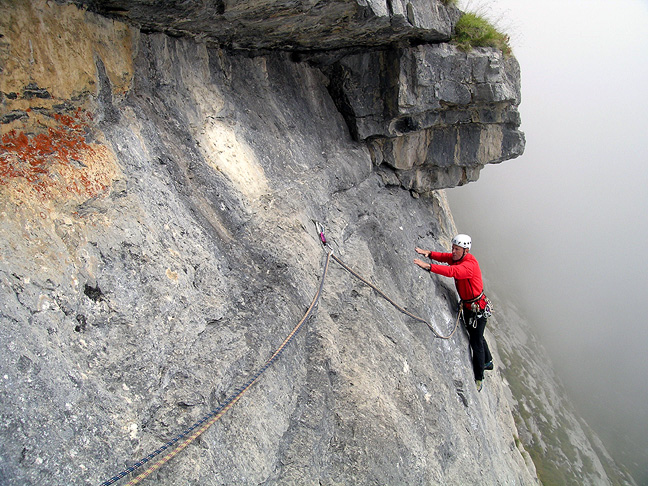 | Emery does a traverse on the first of about six pitches on "Schöne Aussichten". |
