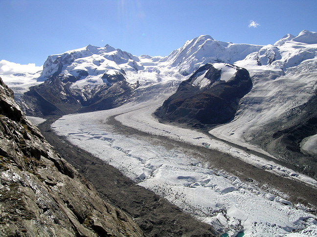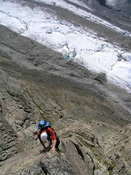 | Climbing the fine outside corner of "Kante" with the Gorner Glacier far below. |