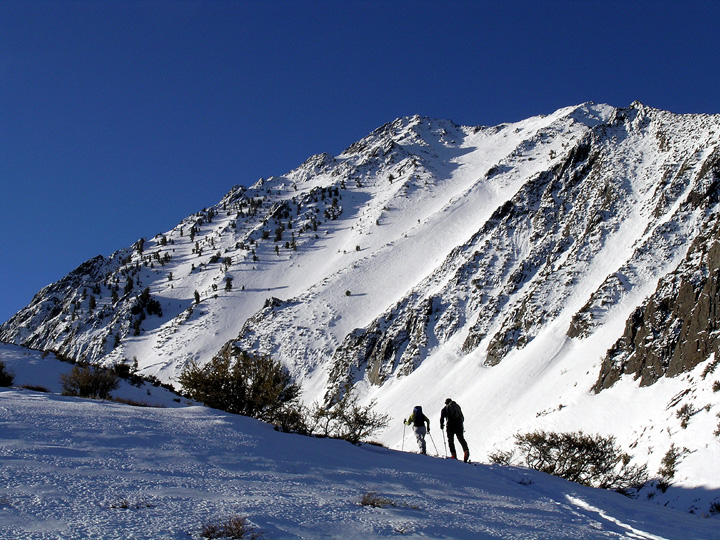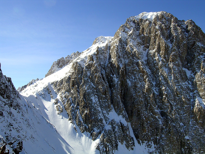 | The view of Mount Morrison from the top of Old Man Bowl. This photo also shows the pass (on the left) to which we climbed after our descent of the Old Man. We skied down the steep-looking couloir seen here, on generally great snow. |