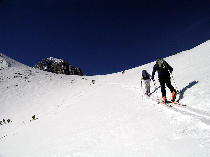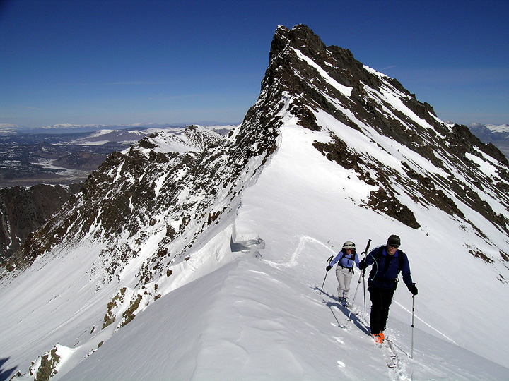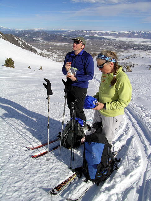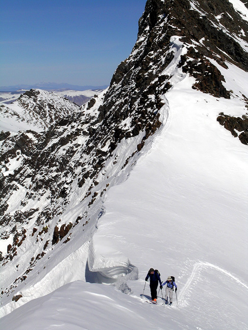 | After a fun descent of Old Man Bowl, we skinned back up around the south side of Little Morrison to a pass between the Big and Little peaks of Morrison. Here, Serge and Kathy arrive at the pass. |
