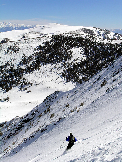 | Serge Dubovitsky drove up from the Los Angeles area to enjoy the weekend with friends in Mammoth, as well as do a fine day of ski touring. Conditions on north-facing slopes had remained good for some days, even though the weather had been warm at lower altitudes. We thought that the bowls of Little Morrison and the big hanging valley between Little and Big Morrison would also still hold good powder. And we were right! Our plan, and what we ultimately did, was to ski up (and down) Old Man Bowl on Little Morrison, then tour around the back side, climbing to the high pass between Little and Big, then ski north back to Convict Lake. About a 5000' day. |