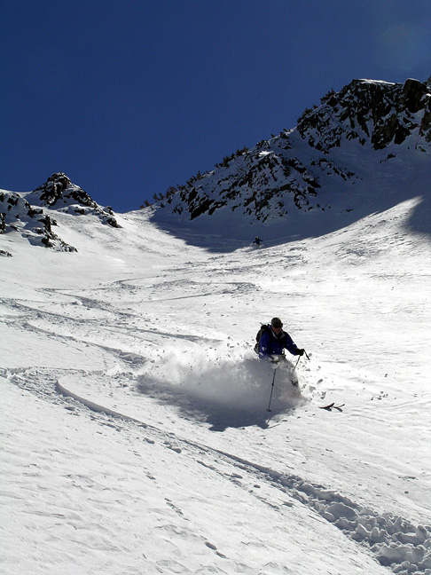 | Here, we have just started the long descent. Serge enjoying the soft snow. |