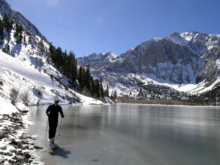 | Oddly, Convict Lake had no snow cover. Not being too sure of the thickness of the ice, we poled along staying quite close to the shore. Our car is only a few short minutes away. |
