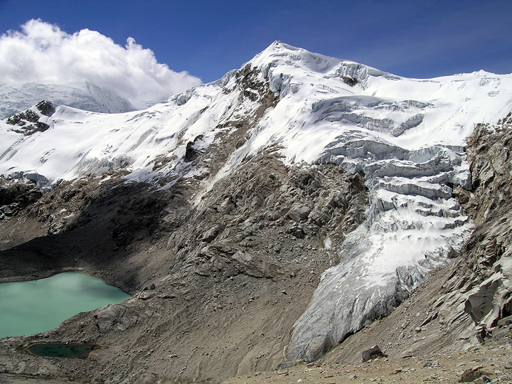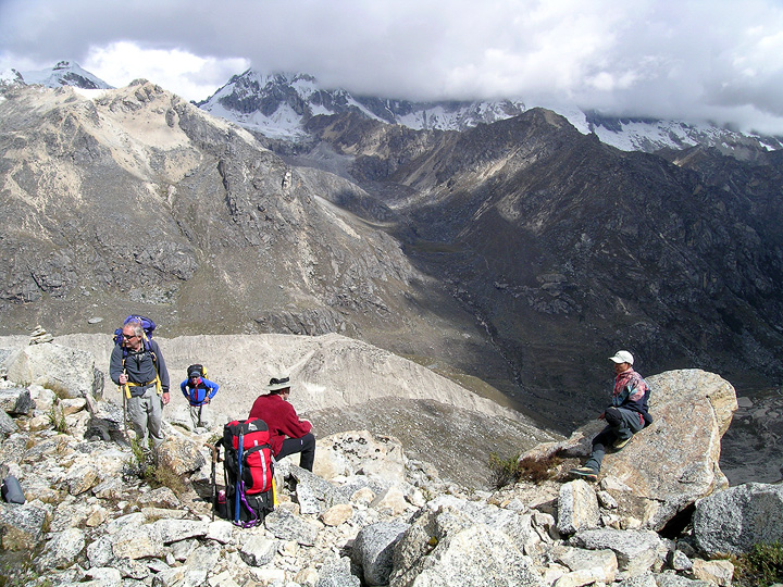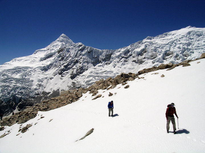 On our first day in the valley we do a day hike. On this particular day we crossed a high 5200 meter pass under Tocllaraju and Palcaraju. Glenn and Mark cross a bit of snow just below the pass. |