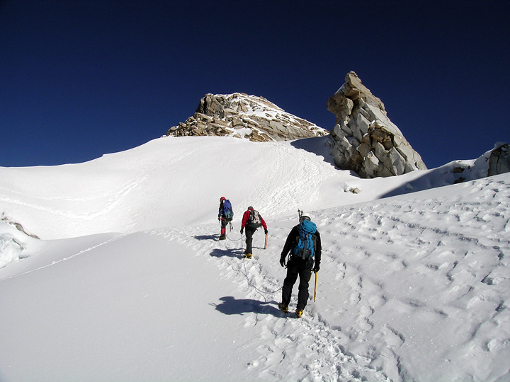 For our first climb, on day 5 of the trip, we climbed Urus Este, a 5420 meter (17,778 feet) peak just above base camp. In this photo Peter, Rich and David near the summit rocks. |