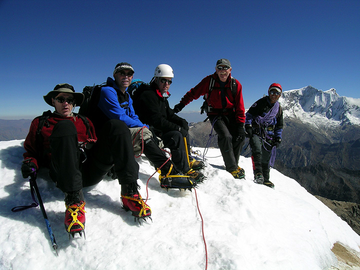 A beautiful day on the summit of Urus Este. From left to right we have Glenn, Marc, David, Rich, Peter, and, some 10 kilometers behind, Nevado Copa. |