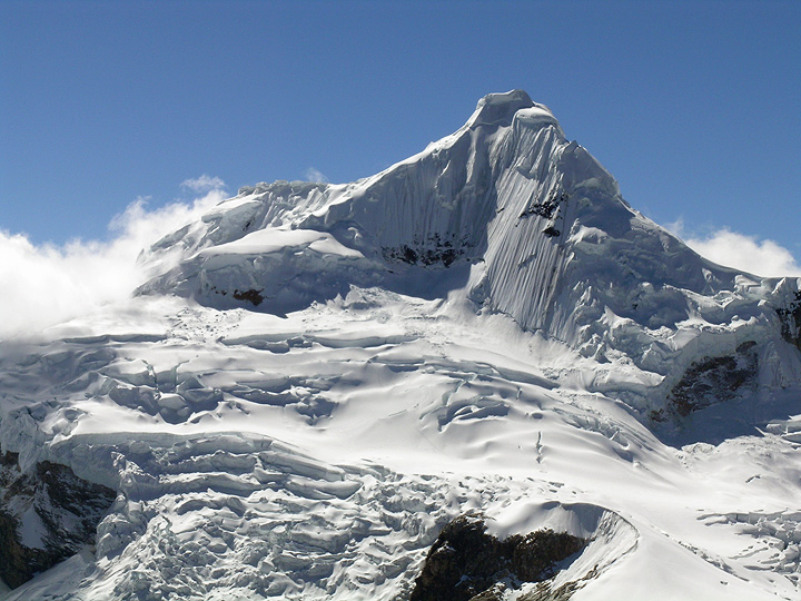 We had a decision to make.... With the bad weather came new snow, and the chances of success on Chopicalqui diminished. With this realization and an understanding that dangerous snow slopes might preclude climbing above high camp, we elected to put our efforts into an ascent of Pisco Oeste, seen here. Pisco is a great peak, 5752 meters (18,867 feet) in the very center of the range. The route climbs easy glacier to the col on the left, then follows the ridge, just on the back side in this view, to the summit. Being a bit further west than Chopicalqui, it tends to be drier, and we had hoped that the new snow of concern on Chopicalqui would be less of an issue on Pisco. We were right. |